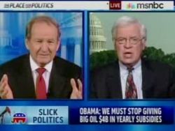 Similar to his two-against-one battle with Bill Press and MSNBC host Ed Schultz in January, conservative Pat Buchanan went at it again this evening with his former "Buchanan & Press" co-host and another liberal MSNBC host, Cenk Uygur.