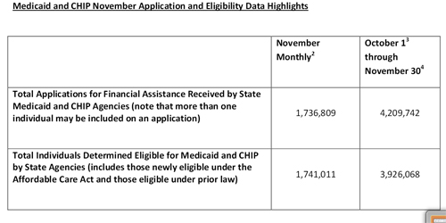 Let’s turn to this chart, which tells us the number of applications for financial assistance received by states in October and November (4,209,742, of which 1,736,809 applied in November), and the number of people who were determined eligible for both Medicaid and the Children’s Health Insurance Program (3,926,068, of which 1,741,011 were determined eligible in November). These numbers are where the “4 million” comes from.