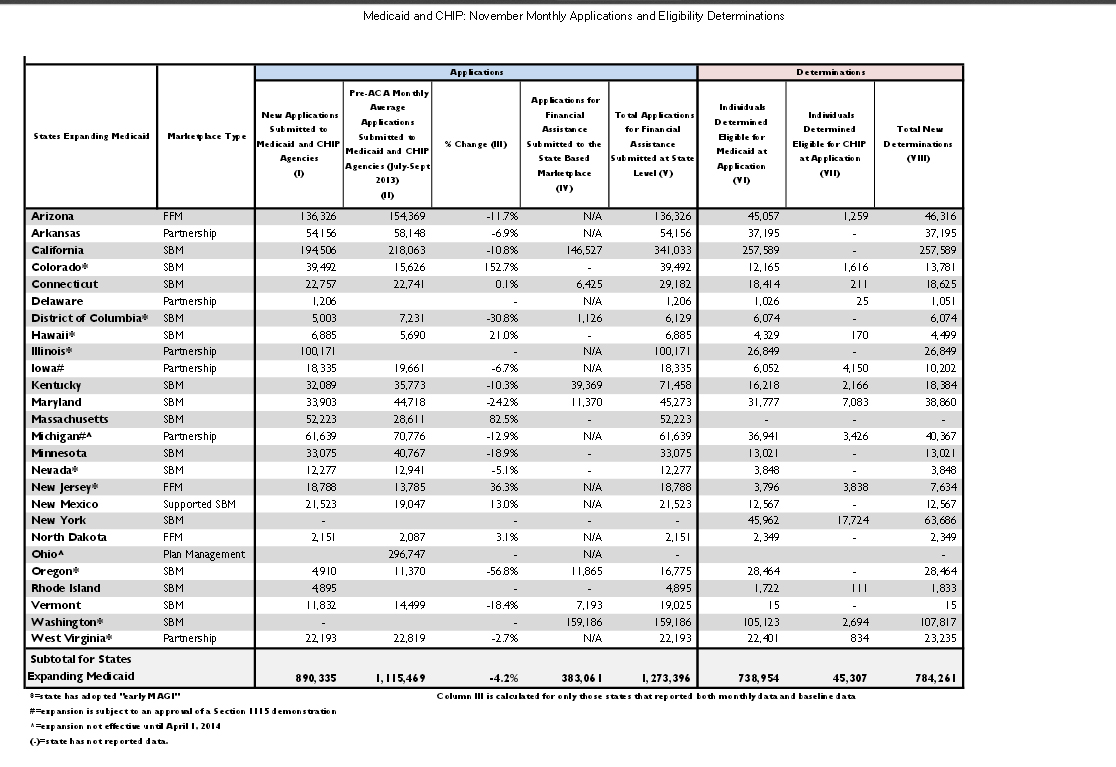 *** CHIP wasn’t expanded significantly as a part of Obamacare, so enrollments in it are probably mostly not due to the new program. At the same time, we don’t have good numbers on the number of Medicaid applications via the federal or state marketplaces -- we have the numbers for some states (column four in the charts), but these numbers include people applying both for Medicaid and tax credits for private insurance. Fortunately, given the state of the marketplaces in October/November and the relatively small number of CHIP applicants, these are pretty small figures.