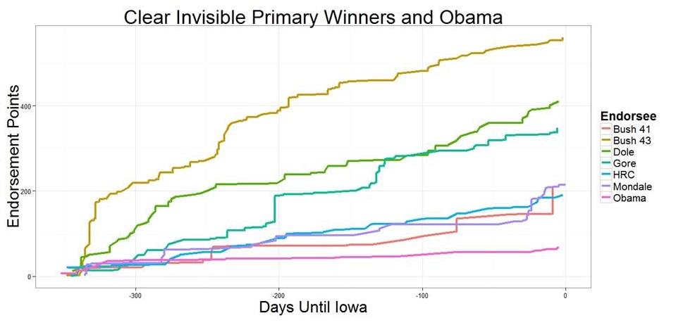 The lines on the graph shows endorsement points for Walter Mondale in 1984, George H.W. Bush in 1988, Bob Dole in 1996, and Al Gore and George W. Bush in 2000 in the year leading up to the Iowa caucuses. According to “The Party Decides” (the authoritative book on the invisible primary and the basis for much of this analysis) each of these candidates won his party’s invisible primary relatively quickly and easily. The blue point shows Hillary Clinton’s endorsement point total as of March 30, 2015 (her endorsements show up as a point because the most complete record of endorsements – compiled at the Hill – does not list dates).